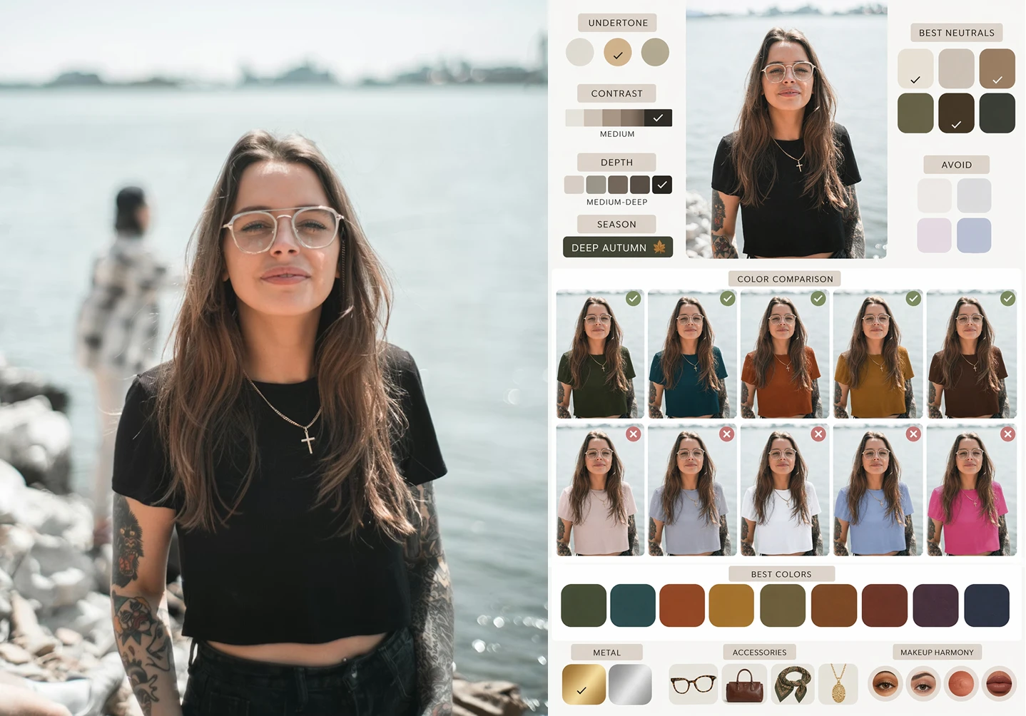 Prompt: Using this portrait, create a diagram-first personal color analysis. Show which clothing colors suit the subject through visual comparison. Keep text minimal and avoid paragraphs.
